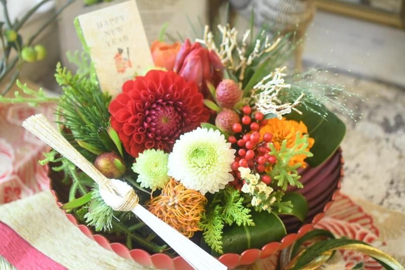 12月29日(月)から31日(水)着 生花お正月アレンジ2026モデル(レッドホワイト)5000円タイプ