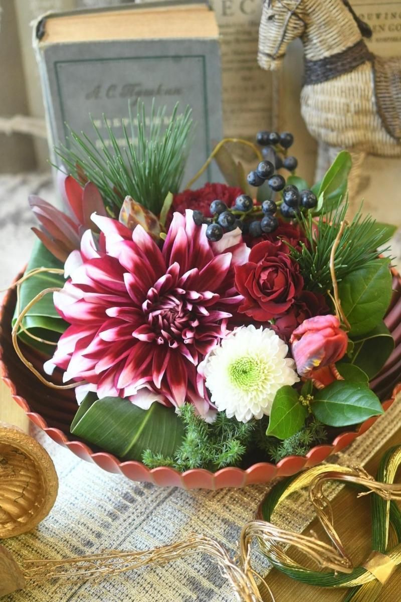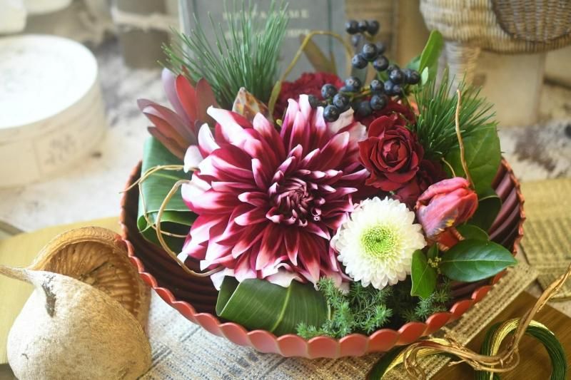 12月29日(月)から31日(水)着 生花お正月アレンジ2026モデル(ワインレッドホワイト)5000円タイプ